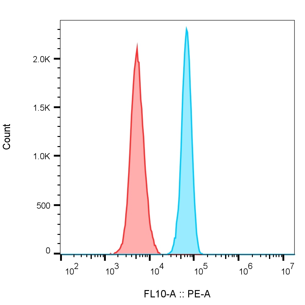 Flow cytometry of Jurkat cells. 1X10^6 Jurkat cells were stained with 0.5 μg anti-HSP90 antibody (13171-1-AP) labeled with FlexAble CoraLite Plus 555 Kit (KFA002, cyan) or with isotype control antibody labeled with FlexAble CoraLite Plus 555 Kit (KFA002, red).