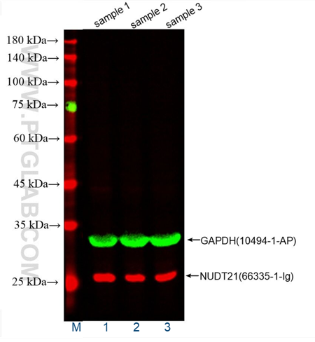 WB of HeLa cell lysates: HeLa cell lysates were detected with anti-GAPDH (10494-1-AP) labeled with FlexAble CoraLite Plus 555 Kit (KFA002, green) and anti-NUDT21 (66335-1-Ig) labeled with FlexAble CoraLite Plus 647 Kit (KFA023, red).