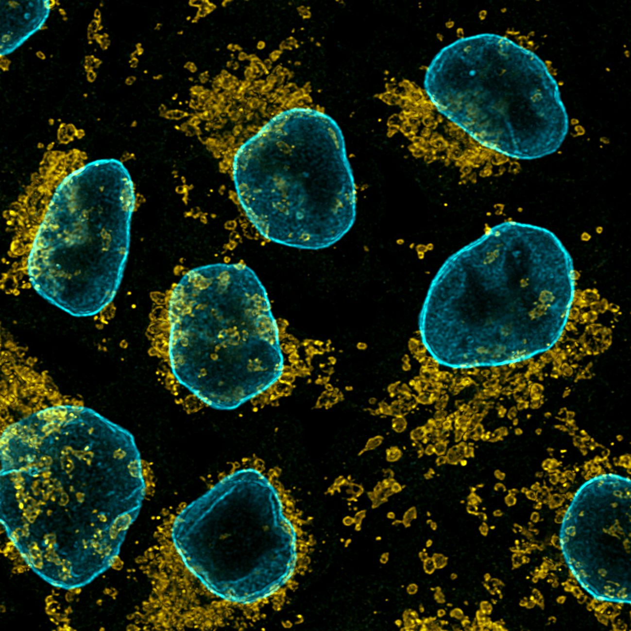 Immunofluorescence of HeLa: PFA-fixed HeLa cells were stained with anti-TOM20 (11802-1-AP) labeled with FlexAble CoraLite Plus 555 Kit (KFA002, yellow) and anti-Lamin B1 (12987-1-AP) labeled with FlexAble CoraLite Plus 647 Kit (KFA003, cyan). Confocal images were acquired with a 100x oil objective and post-processed. Images were recorded at the Core Facility Bioimaging at the Biomedical Center, LMU Munich.