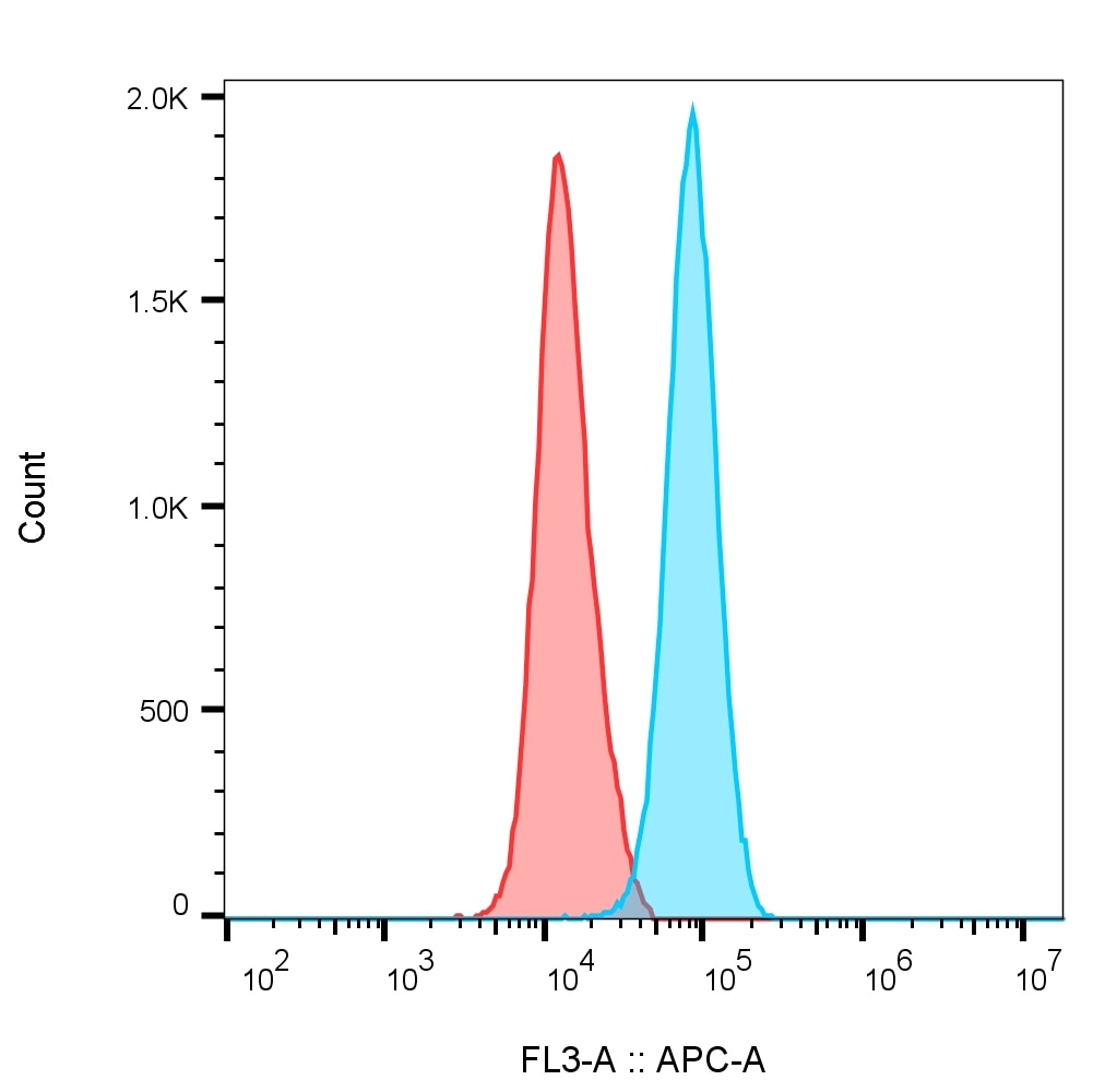 Flow cytometry of Jurkat cells. 1X10^6 Jurkat cells were stained with 0.5 μg anti-HSP90 antibody (13171-1-AP) labeled with FlexAble CoraLite Plus 647 Kit (KFA003, cyan) or with isotype control antibody labeled with FlexAble CoraLite Plus 647 Kit (KFA003, red).