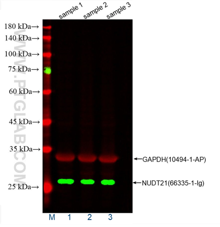 WB of HeLa cell lysates: HeLa cell lysates were detected with anti-GAPDH (10494-1-AP) labeled with FlexAble CoraLite Plus 647 Kit (KFA003, red) and anti-NUDT21 (66335-1-Ig) labeled with FlexAble CoraLite Plus 555 Kit (KFA022, green).