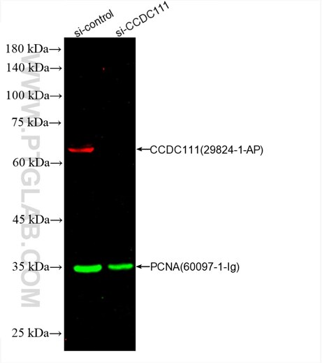 WB of HepG2 cell lysates: siRNA transfected HepG2 cell lysates were detected with anti-CCDC111 (29824-1-AP) labeled with FlexAble CoraLite Plus 647 Kit (KFA003, red) and anti-PCNA (60097-1-Ig) labeled with FlexAble CoraLite Plus 555 Kit (KFA022, green).