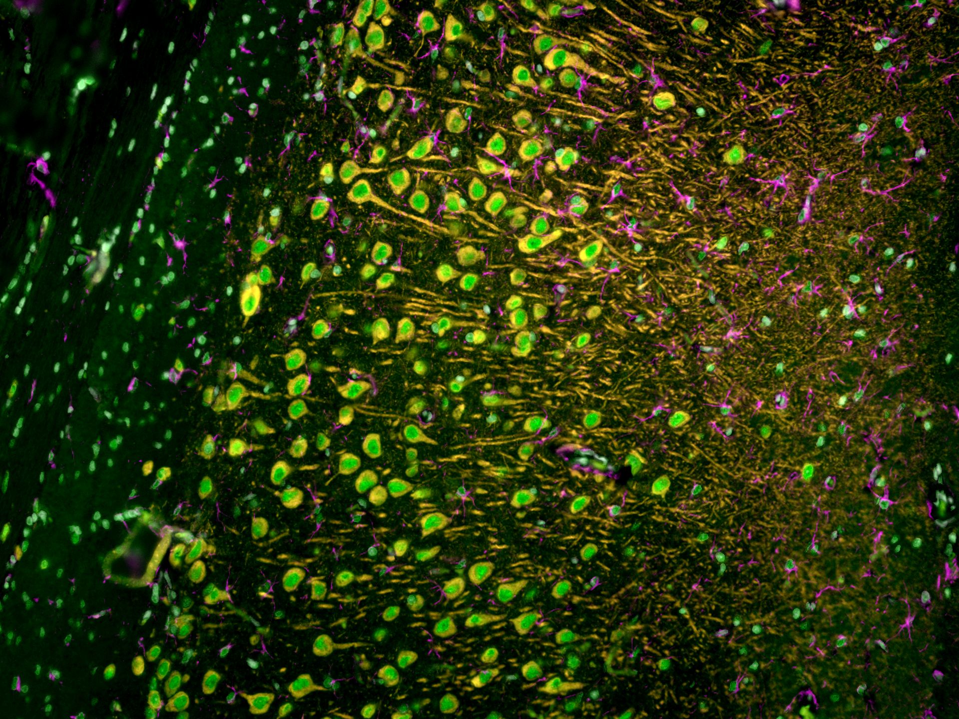 Immunofluorescence of rat brain tissue: FFPE rat brain tissue sections were stained with anti-MAP2 (17490-1-AP) labeled with FlexAble CoraLite Plus 555 Kit (KFA002, orange), anti-GFAP (16825-1-AP) labeled with FlexAble CoraLite Plus 647 Kit (KFA003, magenta) and CoraLite488-conjugated TDP-43 antibody (CL488-10782, green).
