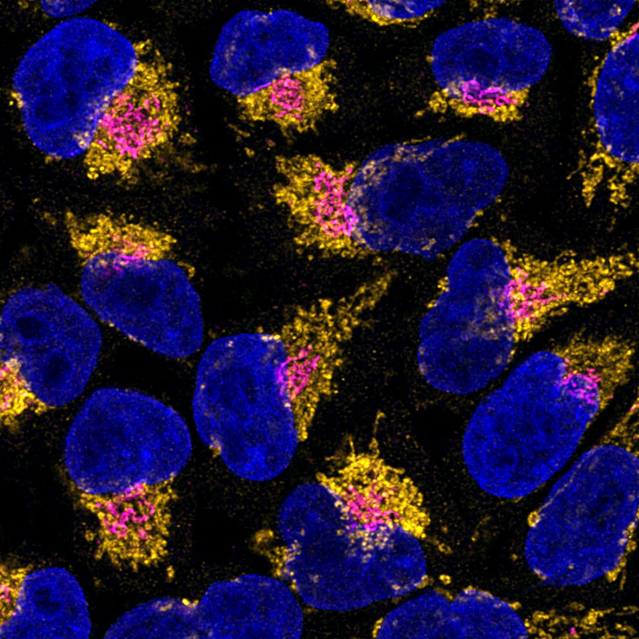Immunofluorescence of HeLa: PFA-fixed HeLa cells were stained with anti-COXIV (11242-1-AP) labeled with FlexAble CoraLite Plus 555 Kit (KFA002, yellow), anti-GM130 (11308-1-AP) labeled with FlexAble CoraLite Plus 647 Kit (KFA003, magenta) and DAPI (blue). Confocal images were acquired with a 100x oil objective and post-processed. Images were recorded at the Core Facility Bioimaging at the Biomedical Center, LMU Munich.