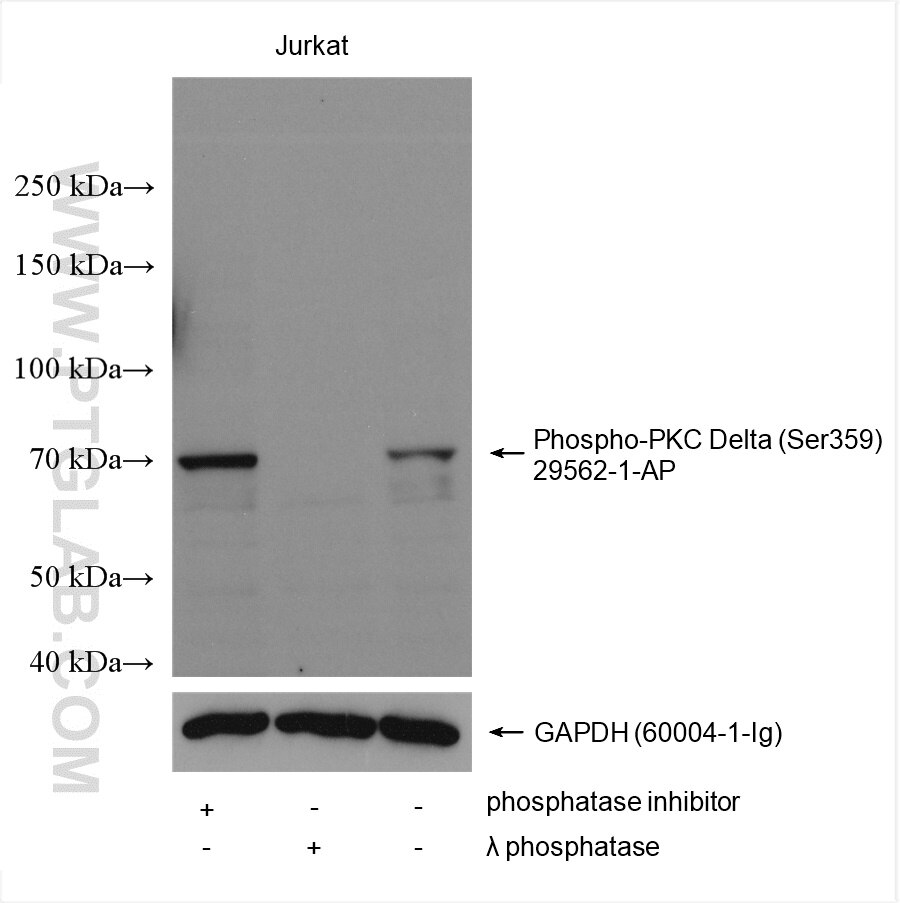The Phospho-PKC Delta (Ser359) antibody from Proteintech is a rabbit polyclonal antibody to a peptide of human Phospho-PKC Delta (Ser359). This antibody recognizes human antigen. The Phospho-PKC Delta (Ser359) antibody has been validated for the following applications: WB, IF/ICC, ELISA analysis.