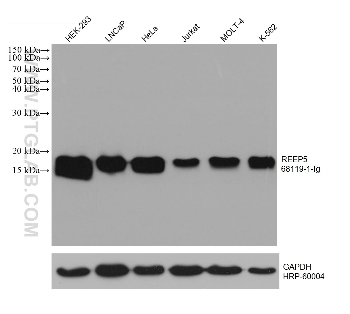 The REEP5 antibody from Proteintech is a mouse monoclonal antibody to a recombinant protein of human REEP5. This antibody recognizes human, pig antigen. The REEP5 antibody has been validated for the following applications: WB, IHC, IF/ICC, ELISA analysis.