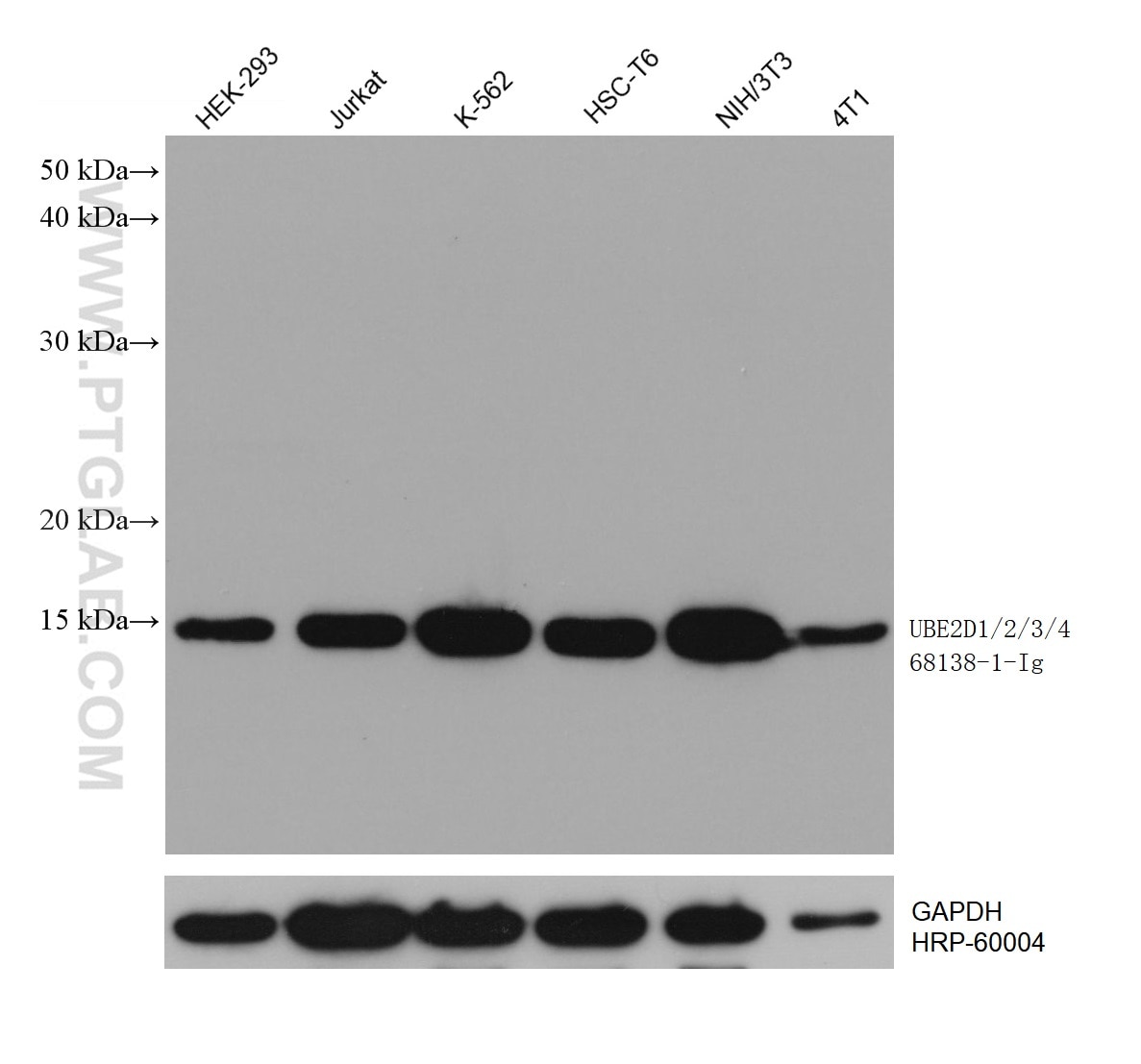 The UBE2D1/2/3/4 antibody from Proteintech is a mouse monoclonal antibody to a recombinant protein of human UBE2D1/2/3/4. This antibody recognizes human, mouse, rat antigen. The UBE2D1/2/3/4 antibody has been validated for the following applications: WB, IF/ICC, ELISA analysis.
