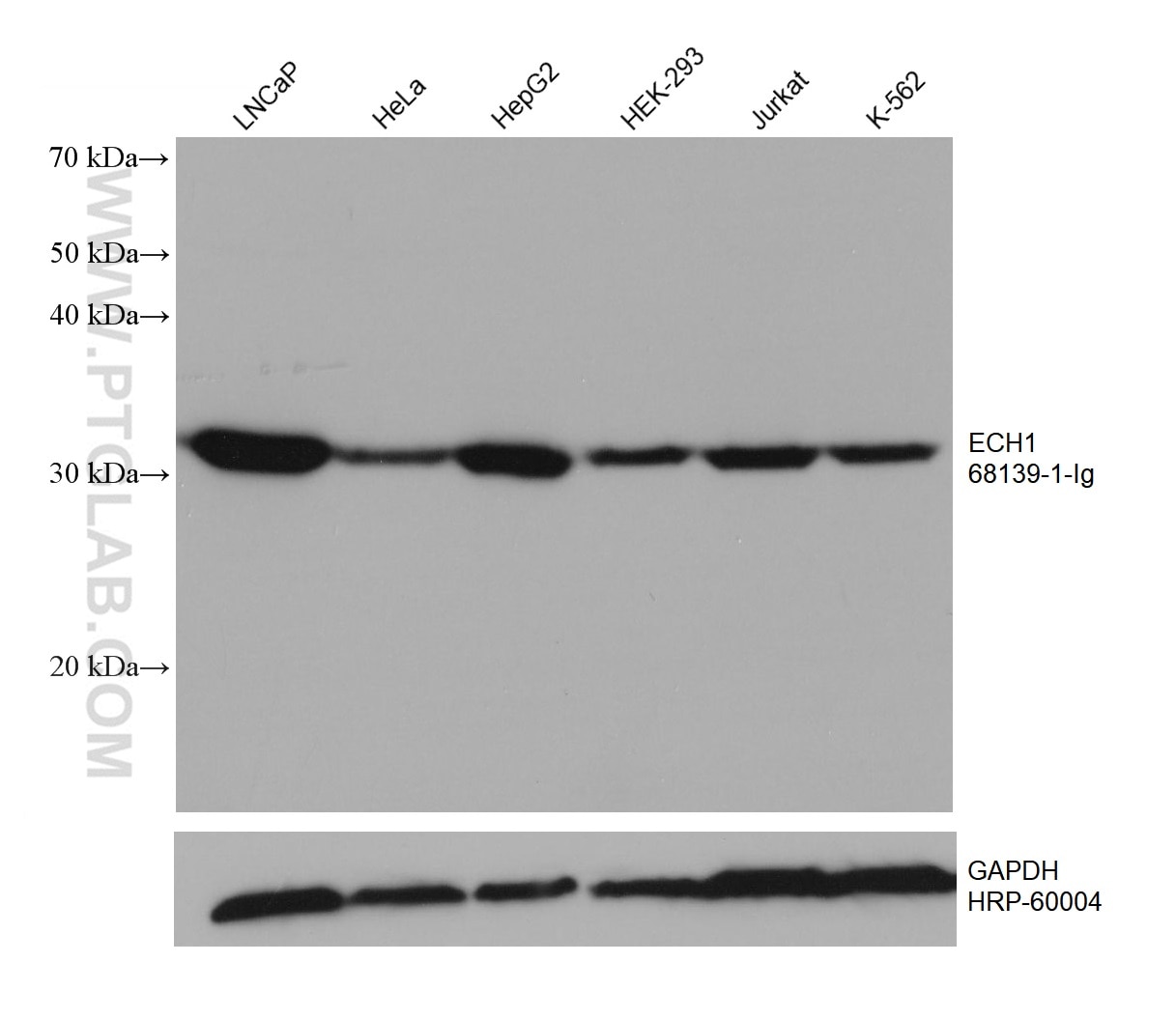 The ECH1 antibody from Proteintech is a mouse monoclonal antibody to a recombinant protein of human ECH1. This antibody recognizes human antigen. The ECH1 antibody has been validated for the following applications: WB, IHC, IF/ICC, ELISA analysis.
