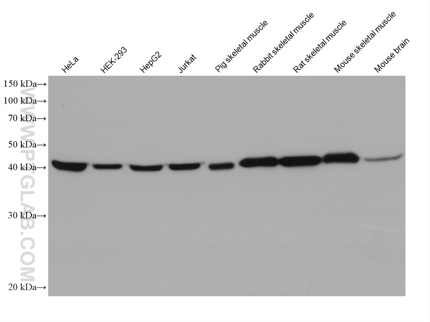 The ENO3 antibody from Proteintech is a mouse monoclonal antibody to a recombinant protein of human ENO3. This antibody recognizes human, mouse, rat, pig antigen. The ENO3 antibody has been validated for the following applications: WB, IF/ICC, ELISA analysis.