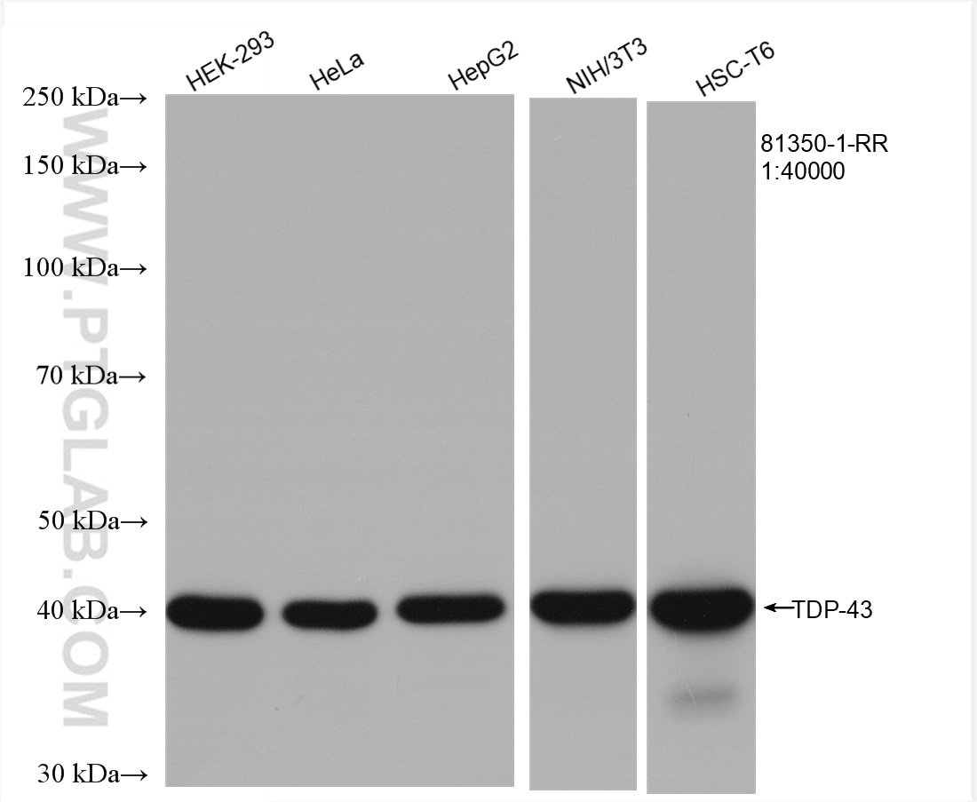 The TDP-43 (C-terminal) antibody from Proteintech is a rabbit recombinant antibody to a recombinant protein of human TDP-43 (C-terminal). This antibody recognizes human, mouse, rat antigen. The TDP-43 (C-terminal) antibody has been validated for the following applications: WB, IHC, IF/ICC, FC (Intra), ELISA analysis.