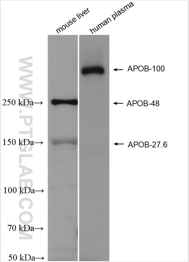 The APOB antibody from Proteintech is a rabbit polyclonal antibody to a peptide of human APOB. This antibody recognizes human, mouse antigen. The APOB antibody has been validated for the following applications: WB analysis. This antibody is hrp.