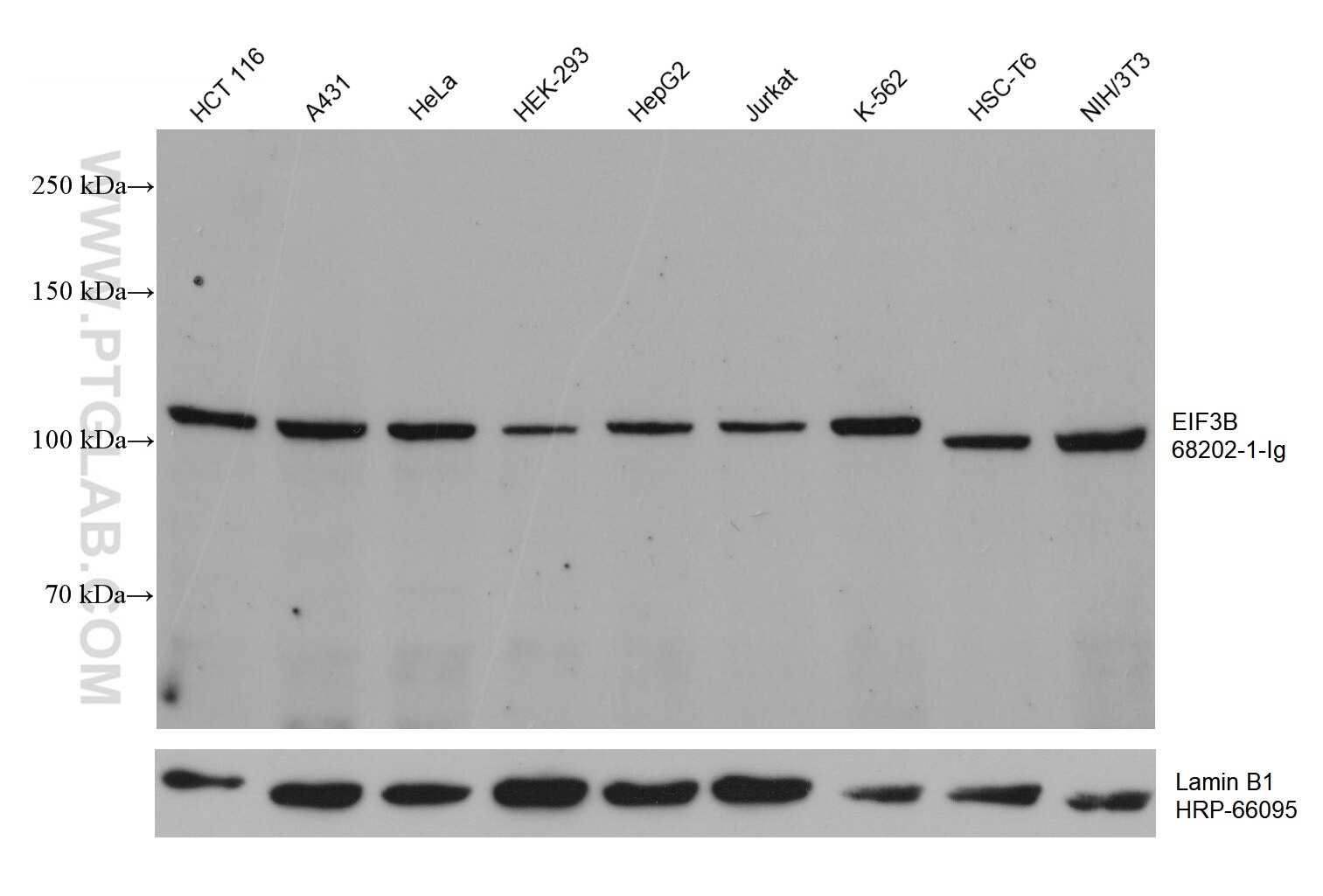The EIF3B antibody from Proteintech is a mouse monoclonal antibody to a recombinant protein of human EIF3B. This antibody recognizes human, mouse, rat antigen. The EIF3B antibody has been validated for the following applications: WB, ELISA analysis.