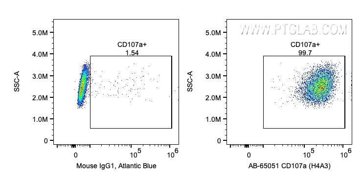The CD107a / LAMP1 antibody from Proteintech is a mouse monoclonal antibody to a human adherent peripheral blood cells of human CD107a / LAMP1. This antibody recognizes human antigen. The CD107a / LAMP1 antibody has been validated for the following applications: FC (Intra) analysis. This antibody is atlantic blue?.