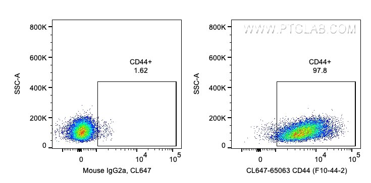 The CD44 antibody from Proteintech is a mouse monoclonal antibody to a purified t cells from human lymph nodes of human CD44. This antibody recognizes human antigen. The CD44 antibody has been validated for the following applications: FC analysis. This antibody is coraliteR plus 647.