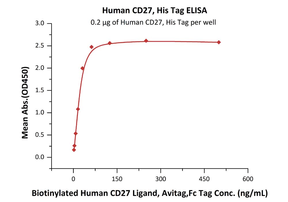 Immobilized Human CD27, His Tag at 2 ug/mL (100 uL/well) can bind Biotinylated Human CD27 Ligand, Avitag,Fc Tag with a linear range of 2-31 ng/mL (QC tested).