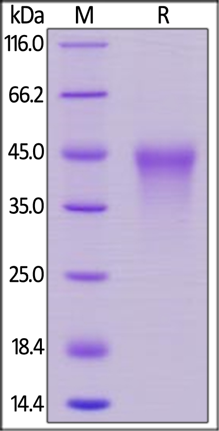 Human CD27, His Tag on SDS-PAGE under reducing (R) condition. The gel was stained overnight with Coomassie Blue. The purity of the protein is greater than 90%.