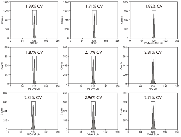 図1 品番URFP-30-2の、Beckman Coulter Cyan? ADPによるヒストグラム (%CV値は、流量、濃度、評価に使用した装置に依存します)