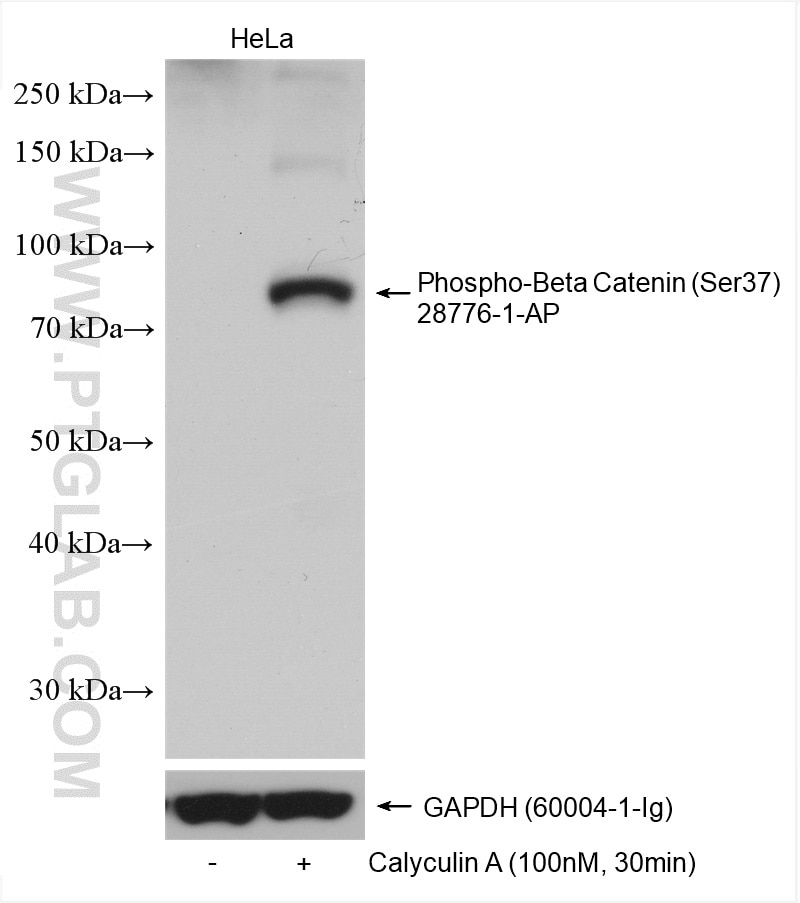 The Phospho-Beta Catenin (Ser37) antibody from Proteintech is a rabbit polyclonal antibody to a peptide of human Phospho-Beta Catenin (Ser37). This antibody recognizes human antigen. The Phospho-Beta Catenin (Ser37) antibody has been validated for the following applications: WB, ELISA analysis.