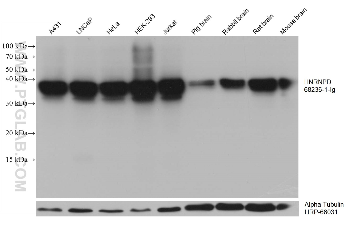 The HNRNPD antibody from Proteintech is a mouse monoclonal antibody to a recombinant protein of human HNRNPD. This antibody recognizes human, mouse, rat, pig, rabbit antigen. The HNRNPD antibody has been validated for the following applications: WB, IHC, IF/ICC, ELISA analysis.
