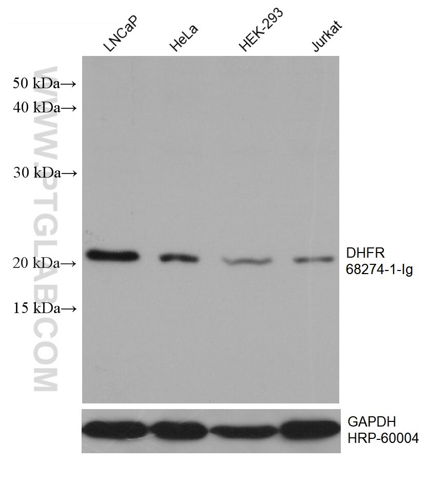 The DHFR antibody from Proteintech is a mouse monoclonal antibody to a recombinant protein of human DHFR. This antibody recognizes human, mouse antigen. The DHFR antibody has been validated for the following applications: WB, FC (Intra), ELISA analysis.