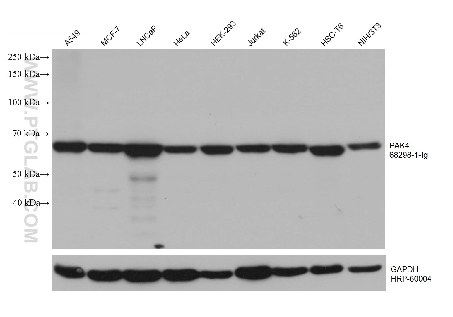 The PAK4 antibody from Proteintech is a mouse monoclonal antibody to a recombinant protein of human PAK4. This antibody recognizes human, mouse, rat antigen. The PAK4 antibody has been validated for the following applications: WB, IF/ICC, ELISA analysis.