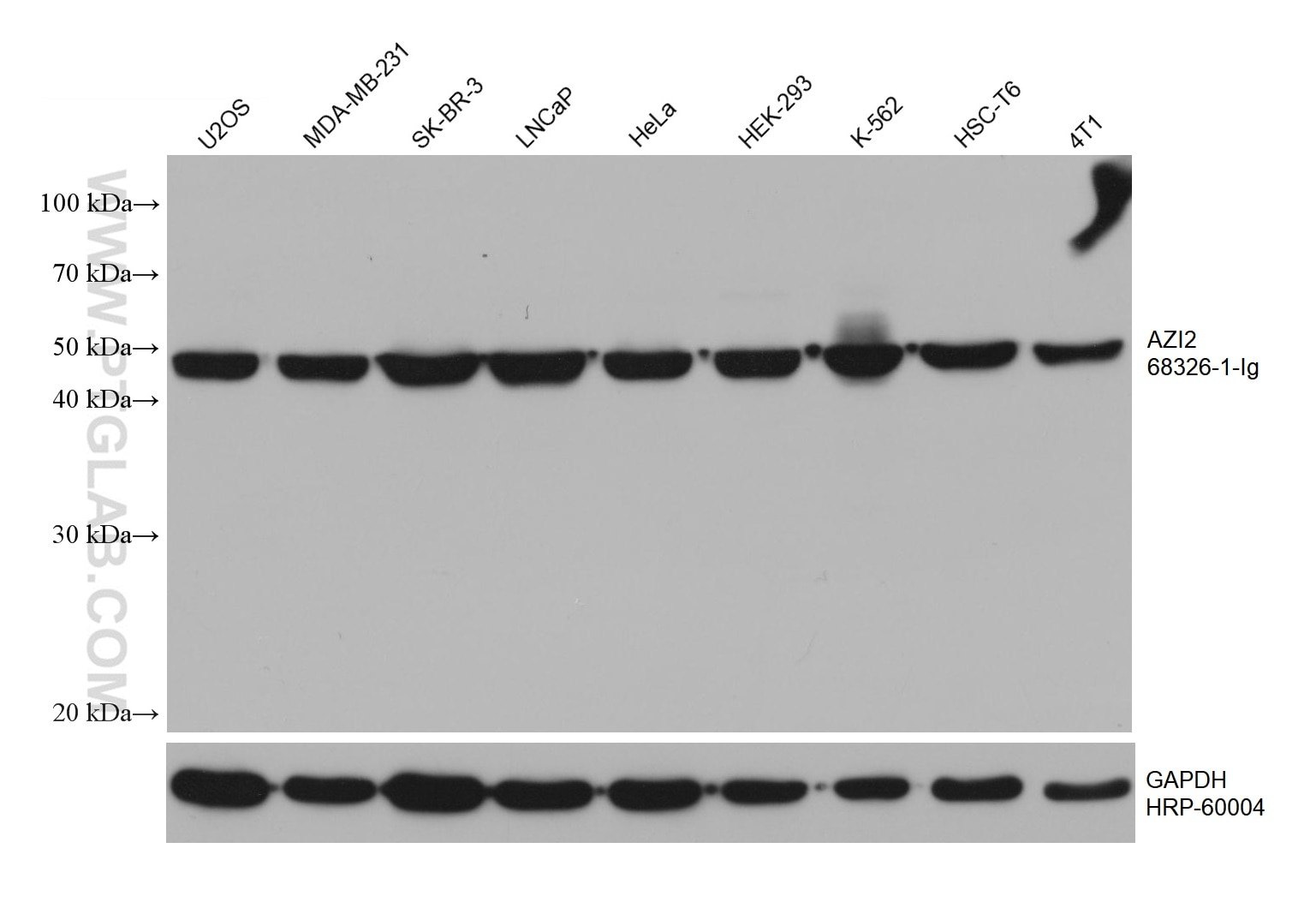 The AZI2 antibody from Proteintech is a mouse monoclonal antibody to a recombinant protein of human AZI2. This antibody recognizes human, mouse, rat antigen. The AZI2 antibody has been validated for the following applications: WB, IF/ICC, ELISA analysis.