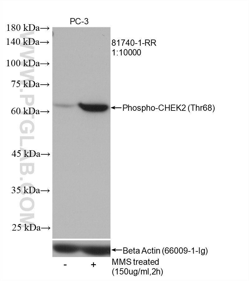 The Phospho-CHEK2 (Thr68) antibody from Proteintech is a rabbit recombinant antibody to a peptide of human Phospho-CHEK2 (Thr68). This antibody recognizes human antigen. The Phospho-CHEK2 (Thr68) antibody has been validated for the following applications: WB, FC (Intra), ELISA analysis.