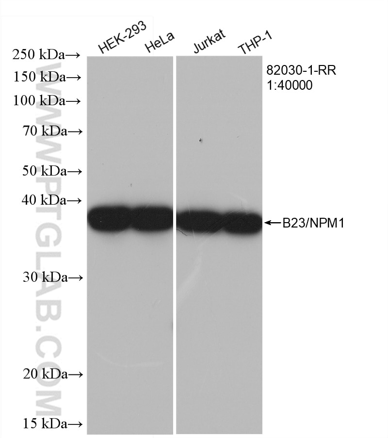 The B23/NPM1 antibody from Proteintech is a rabbit recombinant antibody to a recombinant protein of human B23/NPM1. This antibody recognizes human antigen. The B23/NPM1 antibody has been validated for the following applications: WB, IHC, IF/ICC, IP, ELISA analysis.