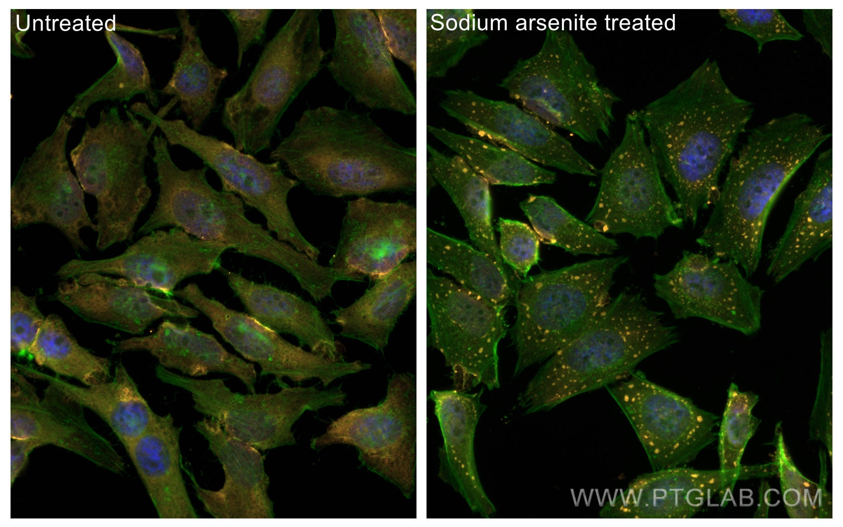 The G3BP1 antibody from Proteintech is a mouse monoclonal antibody to a recombinant protein of human G3BP1. This antibody recognizes human, mouse, rat, pig antigen. The G3BP1 antibody has been validated for the following applications: IF/ICC analysis. This antibody is coraliteR555.