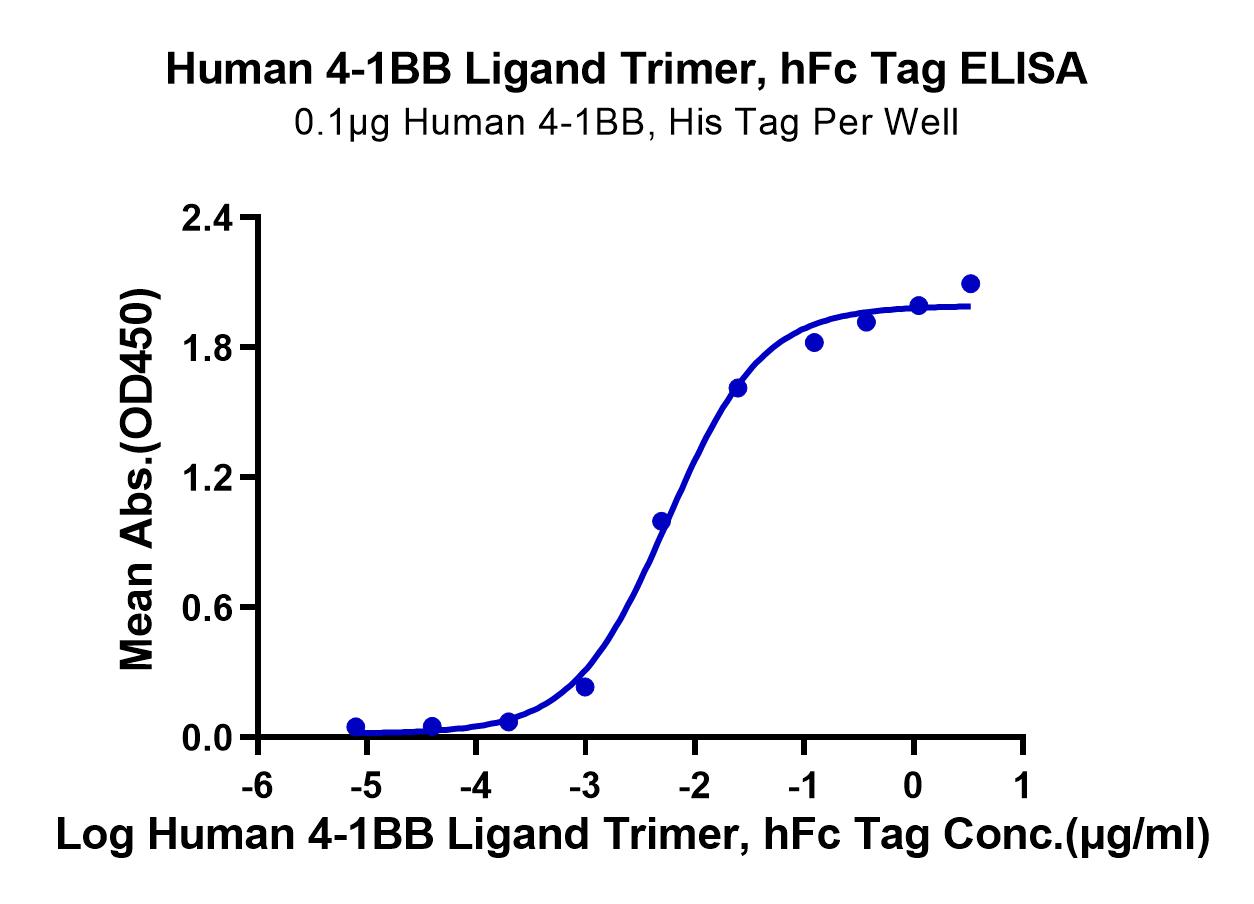 Recombinant Human 4-1BB Ligand/TNFSF9 Trimer Protein is expressed from HEK293 with monomeric hFc tag at the N-Terminus.It contains Arg71-Glu254 trimer design.