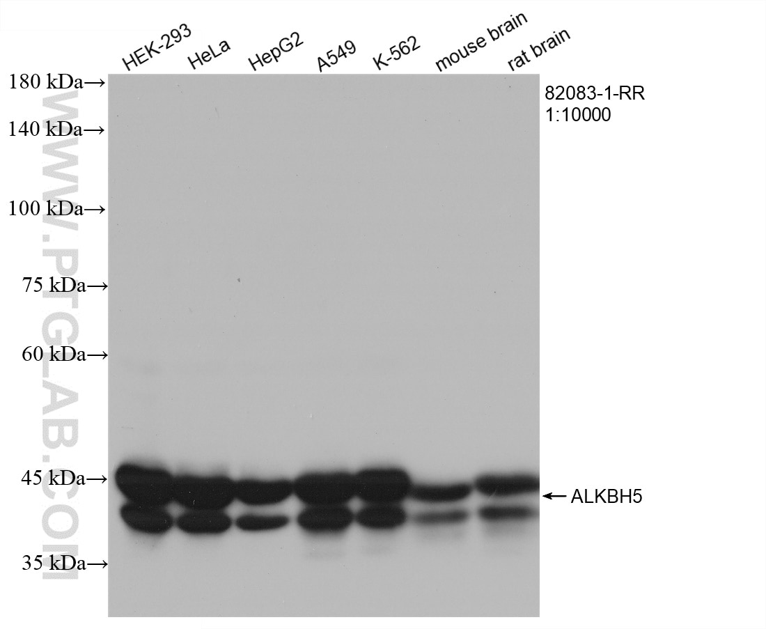 The ALKBH5 antibody from Proteintech is a rabbit recombinant antibody to a recombinant protein of human ALKBH5. This antibody recognizes human, mouse, rat antigen. The ALKBH5 antibody has been validated for the following applications: WB, IF/ICC, ELISA analysis.