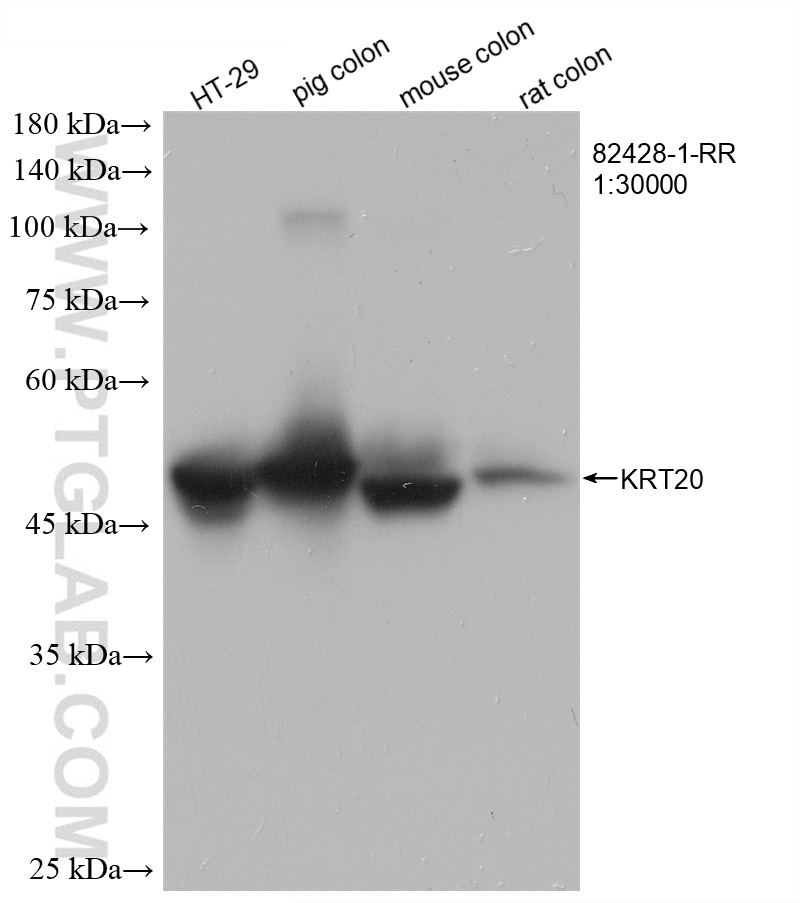 The Cytokeratin 20 antibody from Proteintech is a rabbit recombinant antibody to a recombinant protein of human Cytokeratin 20. This antibody recognizes human, mouse, rat, pig antigen. The Cytokeratin 20 antibody has been validated for the following applications: WB, IHC, IF/ICC, FC (Intra), ELISA analysis.
