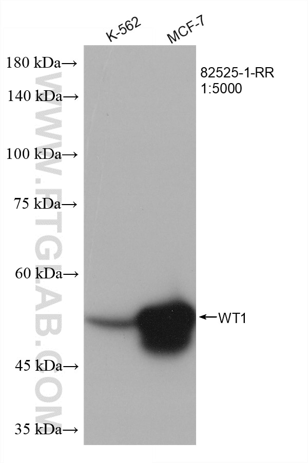 The WT1 antibody from Proteintech is a rabbit recombinant antibody to a recombinant protein of human WT1. This antibody recognizes human, mouse antigen. The WT1 antibody has been validated for the following applications: WB, IP, ELISA analysis.