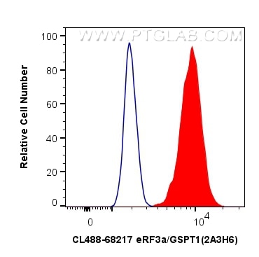 The eRF3a/GSPT1 antibody from Proteintech is a mouse monoclonal antibody to a recombinant protein of human eRF3a/GSPT1. This antibody recognizes human, mouse, rat, pig antigen. The eRF3a/GSPT1 antibody has been validated for the following applications: IF/ICC, FC (Intra) analysis. This antibody is coraliteR plus 488.