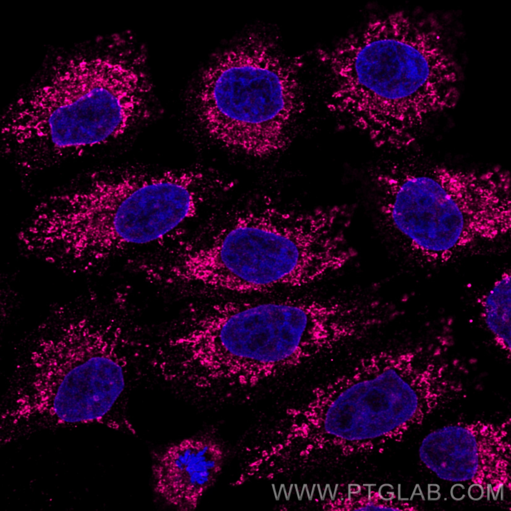 Immunofluorescence of HeLa: PFA-fixed HeLa cells were stained with anti-HDAC2 (676165-1-Ig) labeled with FlexAble CoraLite Plus 488 Kit (KFA061, green), mouse IgG2b anti-Lamin primary and anti-mouse IgG secondary antibody Alexa Fluor 568 (red) and anti-Tom20 (66777-1-Ig) labeled with FlexAble ?CoraLite Plus 647 Kit (KFA063, magenta). Confocal images were acquired with a 100x oil objective and post-processed. Images were recorded at the Core Facility Bioimaging at the Biomedical Center, LMU Munich.