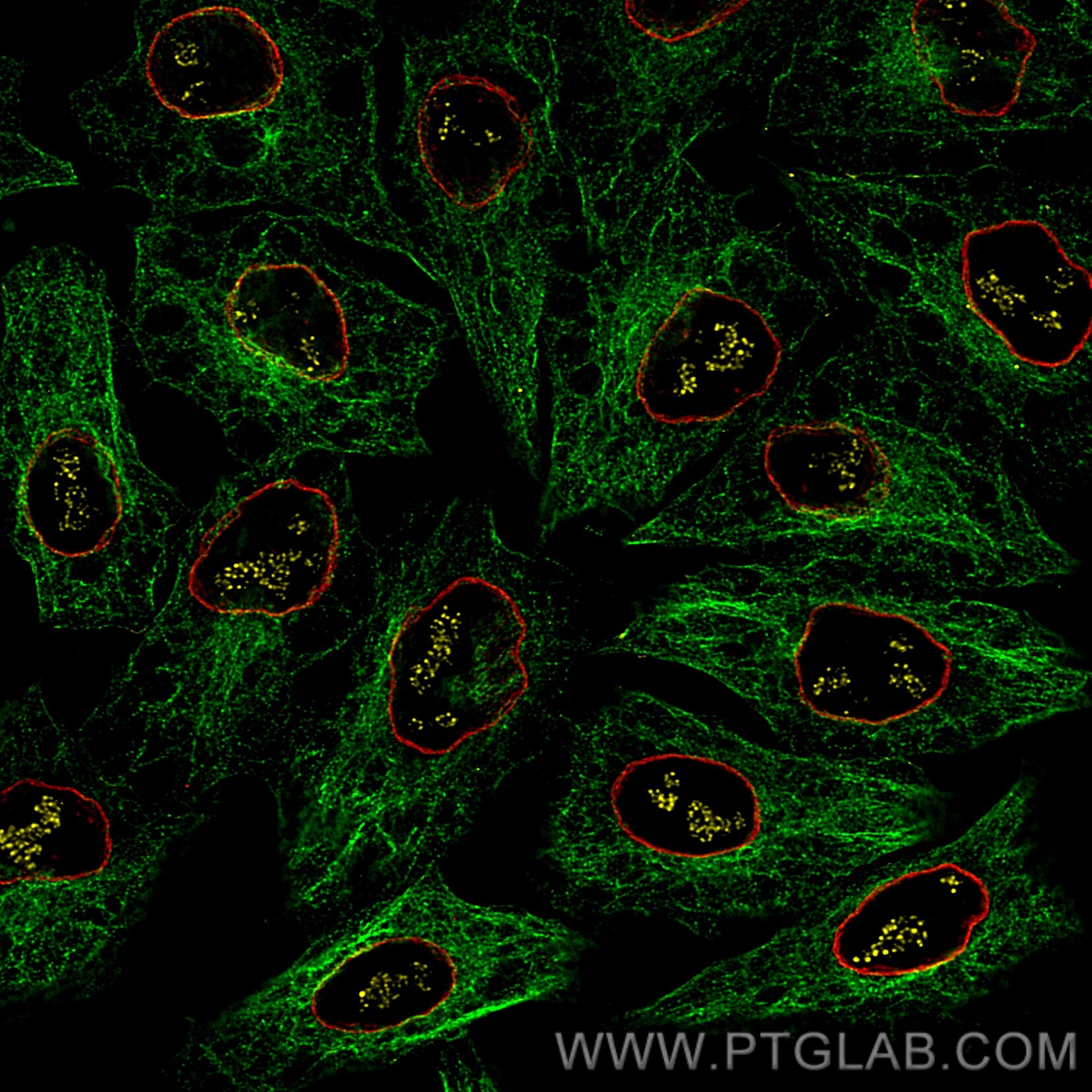Immunofluorescence of HeLa: PFA-fixed HeLa cells were stained with anti-Tubulin antibody labeled with FlexAble CoraLite Plus 488 Kit (KFA061, green), anti-Lamin antibody labeled with FlexAble CoraLite Plus 555 Kit (KFA062, red) and anti-PAF49 antibody labeled with FlexAble CoraLite Plus 647 Kit (KFA063, yellow). Confocal images were acquired with a 100x oil objective and post-processed. Images were recorded at the Core Facility Bioimaging at the Biomedical Center, LMU Munich.