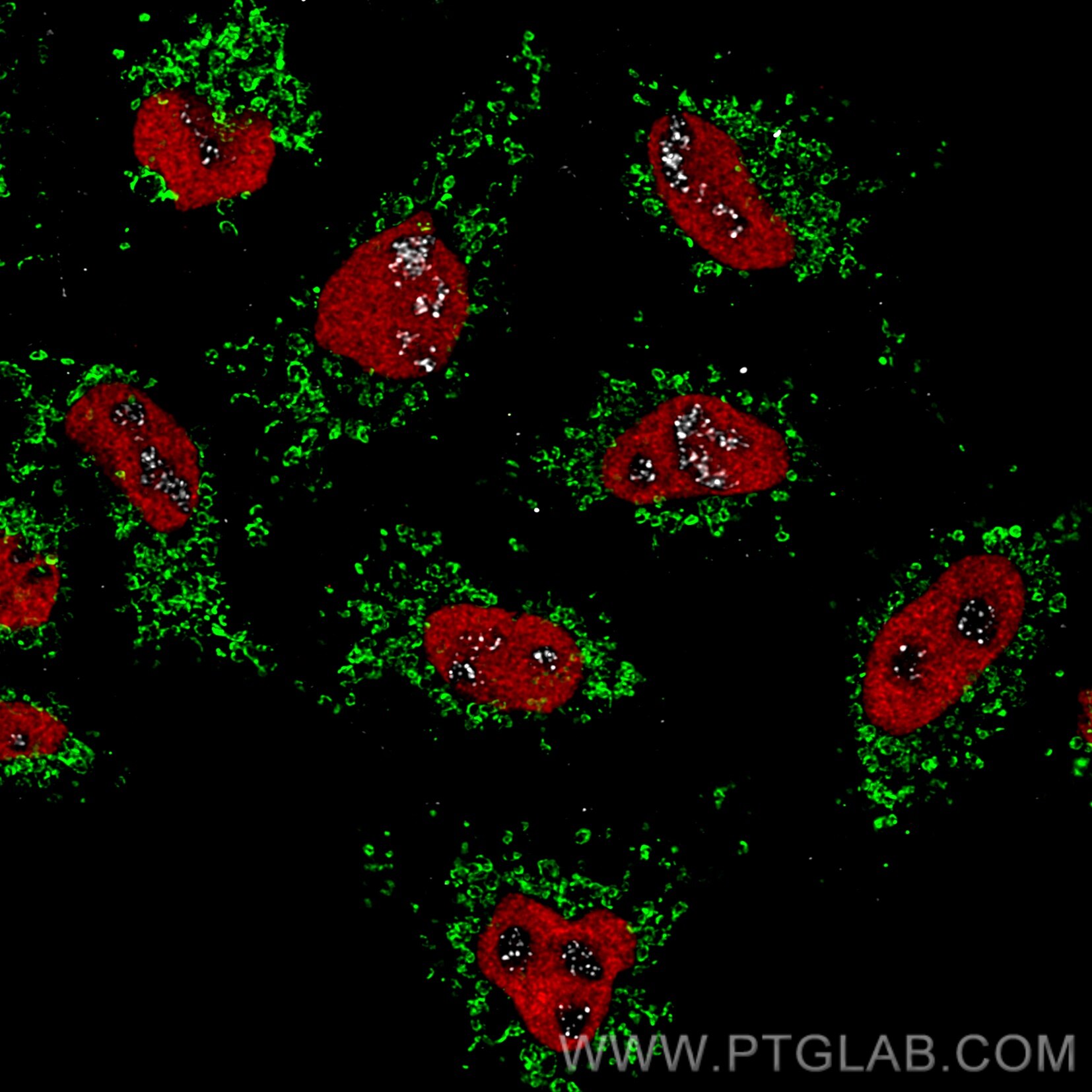 Immunofluorescence of HeLa: PFA-fixed HeLa cells were stained with anti-Tubulin antibody labeled with FlexAble CoraLite Plus 488 Kit (KFA061, green), mouse IgG2b anti-PAF49 primary and anti-mouse IgG secondary antibody Alexa Fluor 568 (red) and CoraLite 647-conjugated HDAC2 antibody (CL647-67615, grey). Confocal images were acquired with a 100x oil objective and post-processed. Images were recorded at the Core Facility Bioimaging at the Biomedical Center, LMU Munich.