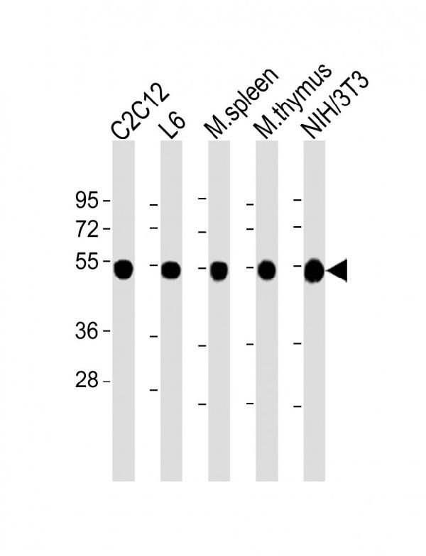 All lanes : Anti-beta Tubulin at 1:2000 dilution Lane 1: C2C12 whole cell lysate Lane 2: L6 whole cell lysate Lane 3: mouse spleen lysate Lane 4: mouse thymus lysate Lane 5: NIH/3T3 whole cell lysate Lysates/proteins at 20 μg per lane. Secondary Goat Anti-Rabbit IgG, (H+L), Peroxidase conjugated at 1/10000 dilution. Predicted band size : 50 kDa Blocking/Dilution buffer: 5% NFDM/TBST.