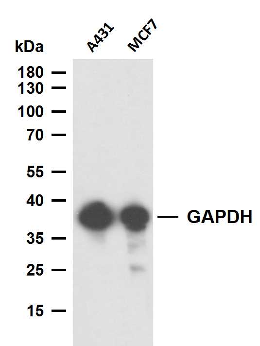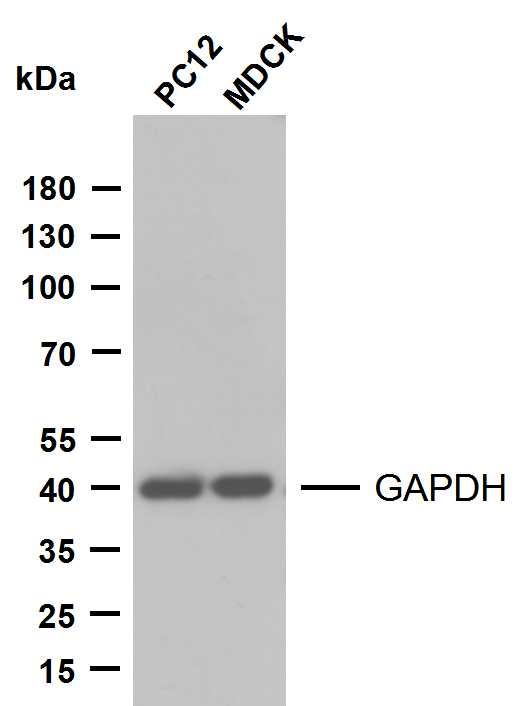 Various whole cell lysates were separated by 10% SDS-PAGE, and the membrane was blotted with GAPDH(PTR2304) antibody. The HRP-conjugated anti-Mouse IgG antibody was used to detect the antibody.Lane 1: PC-12Lane 2: MDCKPredicted band size: 38kDaObserved band size: 38kDa