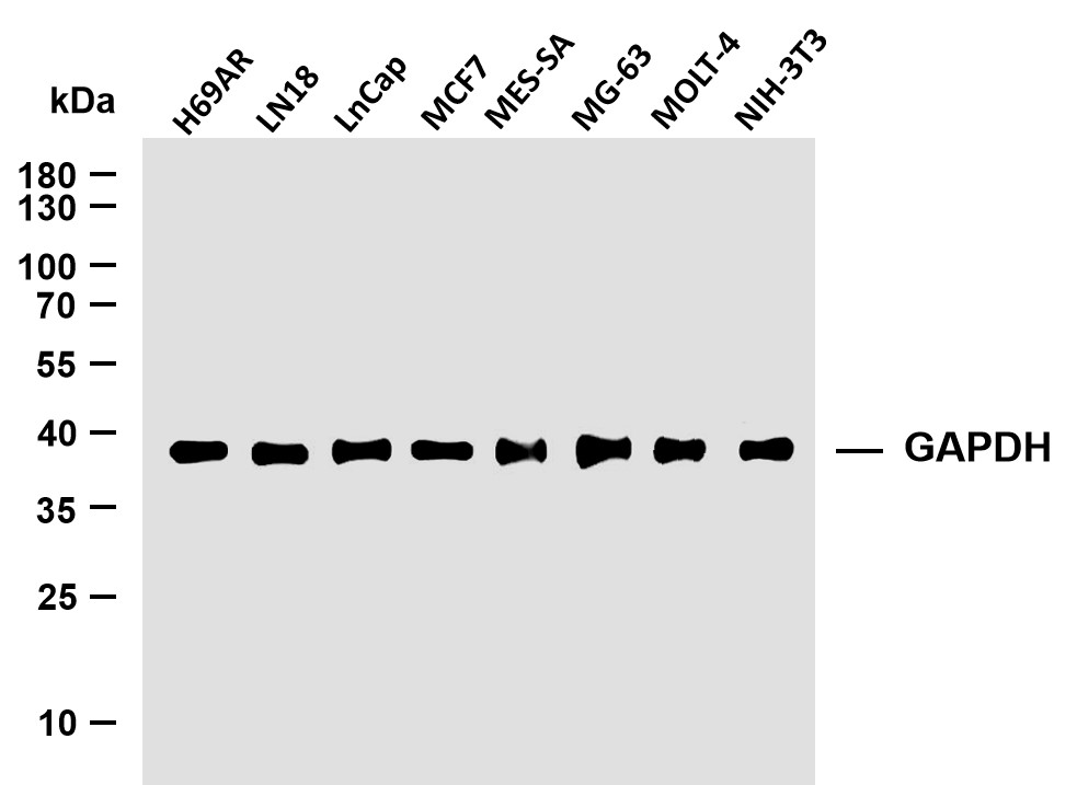 Various whole cell lysates were separated by 4-20% SDS-PAGE, and the membrane was blotted with anti-GAPDH (PTR2304) antibody. The HRP-conjugated Goat anti-Mouse IgG(H + L) antibody was used to detect the antibody.Lane 1:H69ARLane 2: LN18Lane 3: LnCapLane 4: MCF7Lane 5:MES-SALane 6: MG-63Lane 7: MOLT-4Lane 8: NIH-3T3