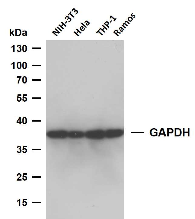 Various whole cell lysates were separated by 10% SDS-PAGE, and the membrane was blotted with anti-GAPDH(PTR2304)antibody. The HRP-conjugated Goat anti-Mouse IgG(H + L) antibody was used to detect the antibody.Lane 1: NIH-3T3Lane 2: MCF7Lane 3: THP-1Lane 4: RamosPredicted band size: 38kDaObserved band size: 38kDa