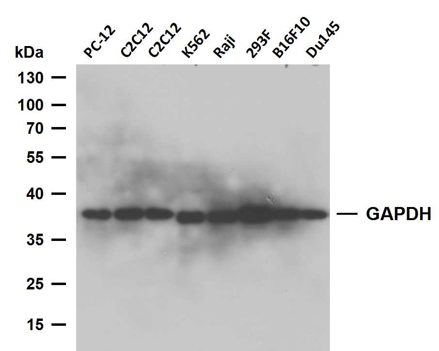 Various whole cell lysates were separated by 10% SDS-PAGE, and the membrane was blotted with anti-GAPDH(PTR2304)antibody. The HRP-conjugated Goat anti-Mouse IgG(H + L) antibody was used to detect the antibody.Lane 1: PC-12Lane 2: C2C12Lane 3: C2C12Lane 4: K562Lane 5: RajiLane 6: 293FLane 7: B16F10Lane 8: Du145Predicted band size: 38kDaObserved band size: 38kDa