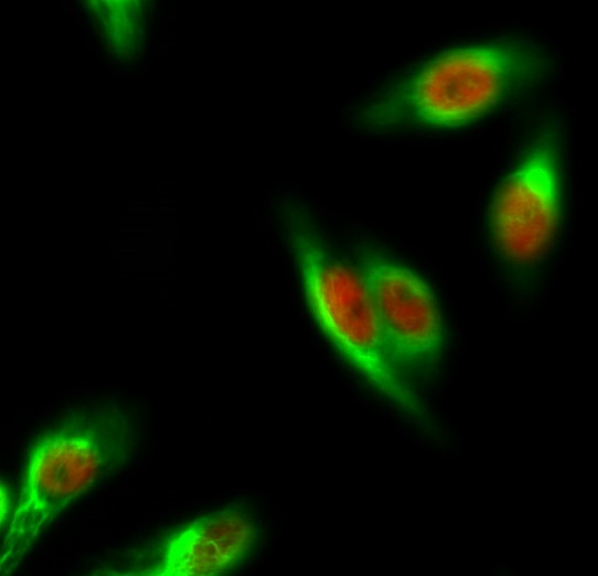 Immunofluorescence analysis of Hela cell. 1,ERα Polyclonal Antibody(red) was diluted at 1:200(4° overnight). Caspase-8 Monoclonal Antibody(2G12)(green) was diluted at 1:200(4° overnight). 2, Goat Anti Rabbit Alexa Fluor 594 Catalog:SA0837 was diluted at 1:1000(room temperature, 50min). Goat Anti Mouse Alexa Fluor 488 Catalog:SA0662 was diluted at 1:1000(room temperature, 50min).