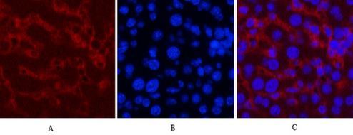 Immunofluorescence analysis of Mouse-liver tissue. 1,Caspase-8 Monoclonal Antibody(2G12)(red) was diluted at 1:200(4°C,overnight). 2, Cy3 labled Secondary antibody was diluted at 1:300(room temperature, 50min).3, Picture B: DAPI(blue) 10min. Picture A:Target. Picture B: DAPI. Picture C: merge of A+B