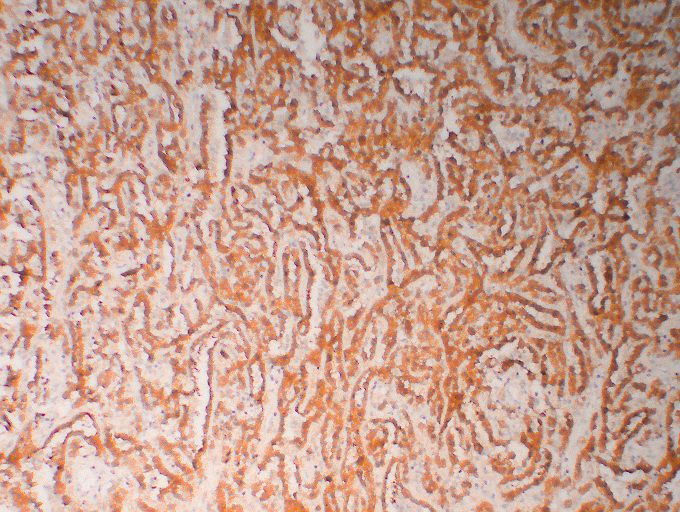 Human mesothelioma tissue was stained with anti-Calretinin(ABT-Calret 1) antibody.