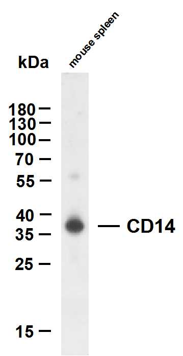 Mouse spleen whole cell lysates were separated by 12% SDS-PAGE, and the membrane was blotted with anti-CD14(ABT021) antibody. The HRP-conjugated Goat anti-Mouse IgG(H + L) antibody was used to detect the antibody.Lane 1: mouse spleenPredicted band size: 40kDaObserved band size: 40kDa