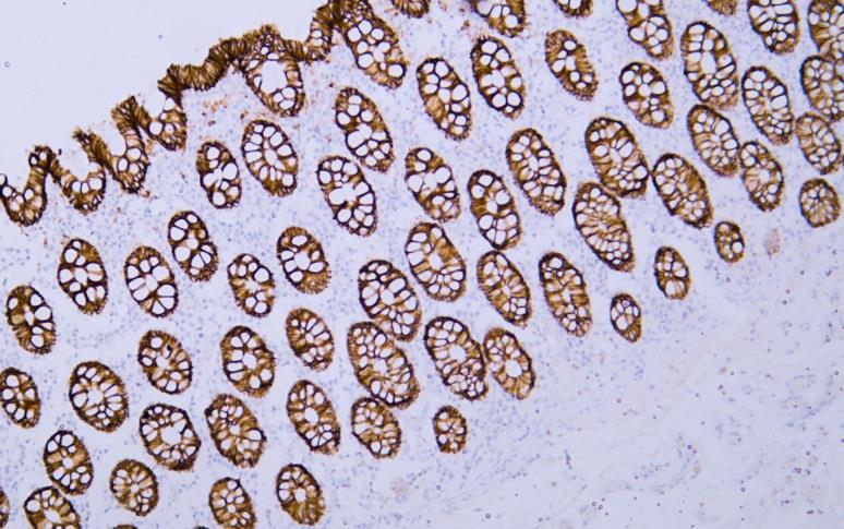 Human colon tissue was stained with Anti-Claudin 7 (ABT441) Antibody