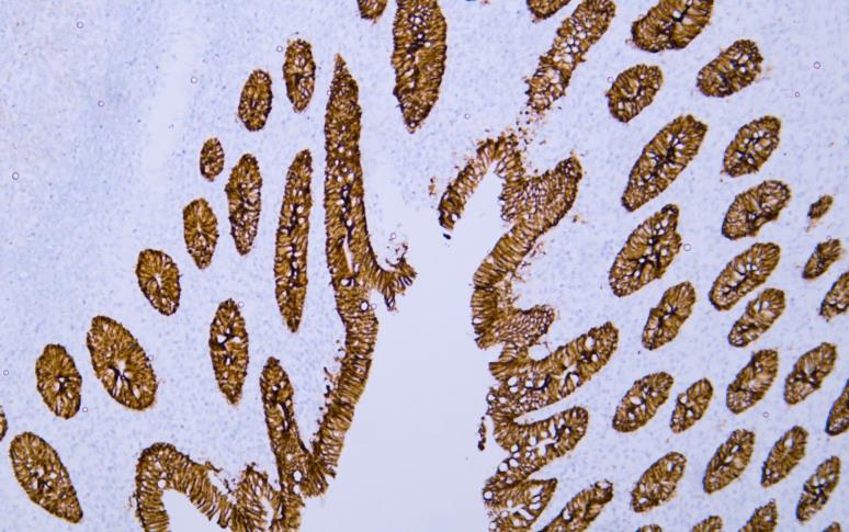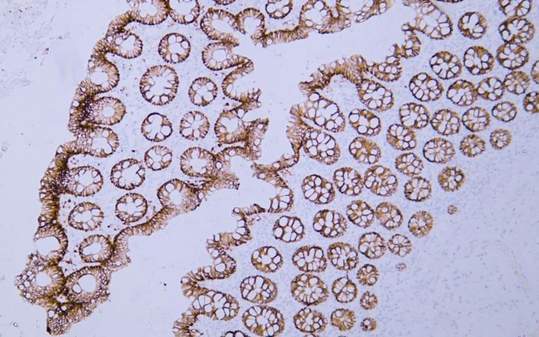 Human colon tissue was stained with Anti-Claudin 7 (ABT443) Antibody
