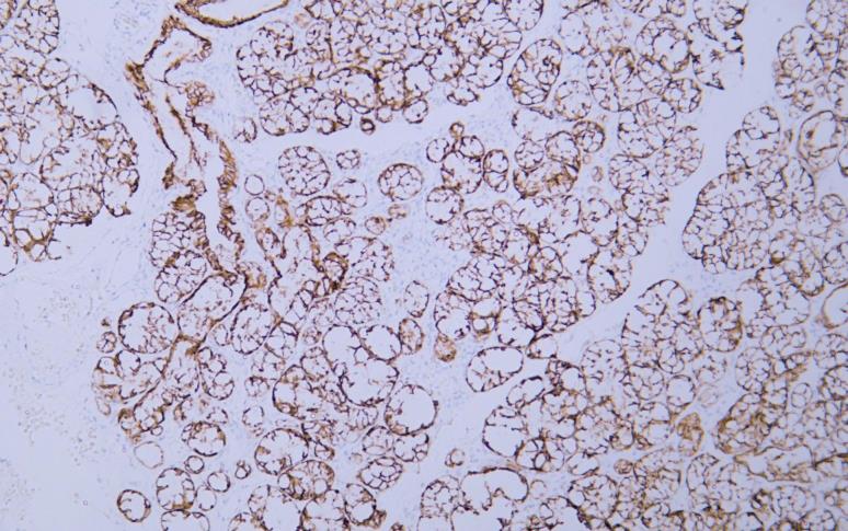 Human salivary gland tissue was stained with Anti-Claudin 7 (ABT443) Antibody