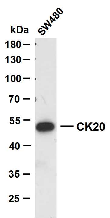 SW480 whole cell lysates were separated by 10% SDS-PAGE, and the membrane was blotted with anti-CK20(ABT044) antibody. The HRP-conjugated Goat anti-Mouse IgG(H + L) antibody was used to detect the antibody.Lane 1: SW480Predicted band size: 48kDaObserved band size: 48kDa